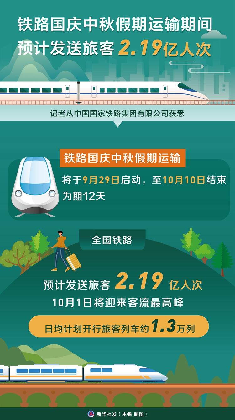新華社北京9月28日電(記者樊曦)記者從中國(guó)國(guó)家鐵路集團(tuán)有限公司獲悉,鐵路國(guó)慶中秋假期運(yùn)輸將于9月29日啟動(dòng),至10月10日結(jié)束,為期12天,全國(guó)鐵路預(yù)計(jì)發(fā)送旅客2.19億人次,10月1日將迎來(lái)客流最高峰,日均計(jì)劃開(kāi)行旅客列車(chē)約1.3萬(wàn)列。