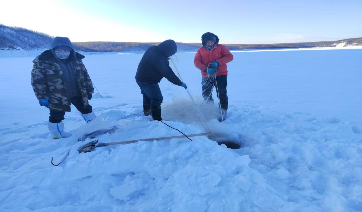 為確保首次冬捕成功,組建捕撈團(tuán)隊(duì),邀請經(jīng)驗(yàn)豐富的漁工指導(dǎo),從漁網(wǎng)鋪設(shè)、冰面鑿洞到捕撈作業(yè),每一個(gè)環(huán)節(jié)都精心部署、規(guī)范操作,最終實(shí)現(xiàn)首網(wǎng)豐產(chǎn)的喜人成果。