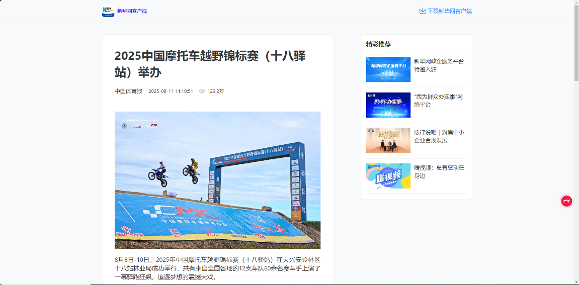 ——主題宣傳聲勢(shì)強(qiáng)勁,上央媒、亮品牌。聚焦生態(tài)建設(shè)、產(chǎn)業(yè)發(fā)展、先進(jìn)典型等,深挖工作亮點(diǎn),全媒體發(fā)稿量超3800篇,其中國(guó)家級(jí)媒體310余篇、省級(jí)媒體270余篇?!?025中國(guó)摩托車越野錦標(biāo)賽舉辦》《小熊下樹!哎喲喲下得挺快》等作品登上央視新聞、新華社、光明網(wǎng)、學(xué)習(xí)強(qiáng)國(guó)、中國(guó)綠色時(shí)報(bào)等國(guó)家級(jí)平臺(tái);2025中國(guó)摩托車越野錦標(biāo)賽、文藝演出等活動(dòng)通過新華社現(xiàn)場(chǎng)云等平臺(tái)直播,總點(diǎn)擊量超300萬次,“十八驛站”知名度與美譽(yù)度顯著提升。
