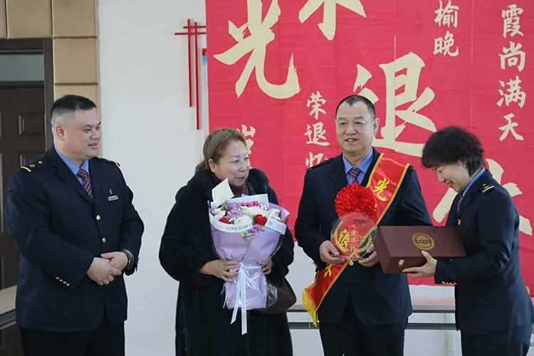 客運段團委書記張蔚萌代表段黨委,為馮春生同志送上誠摯的祝福,并鄭重地遞上鐫刻著“光榮退休”字樣的紀(jì)念牌。緊接著,班組精心準(zhǔn)備的一份“驚喜”將現(xiàn)場氣氛推向高潮——馮春生同志的愛人捧著鮮花,在大家的掌聲中走上臺來。夫妻二人相視而笑,這份來自家庭的溫暖與支持,讓馮春生同志感動不已。